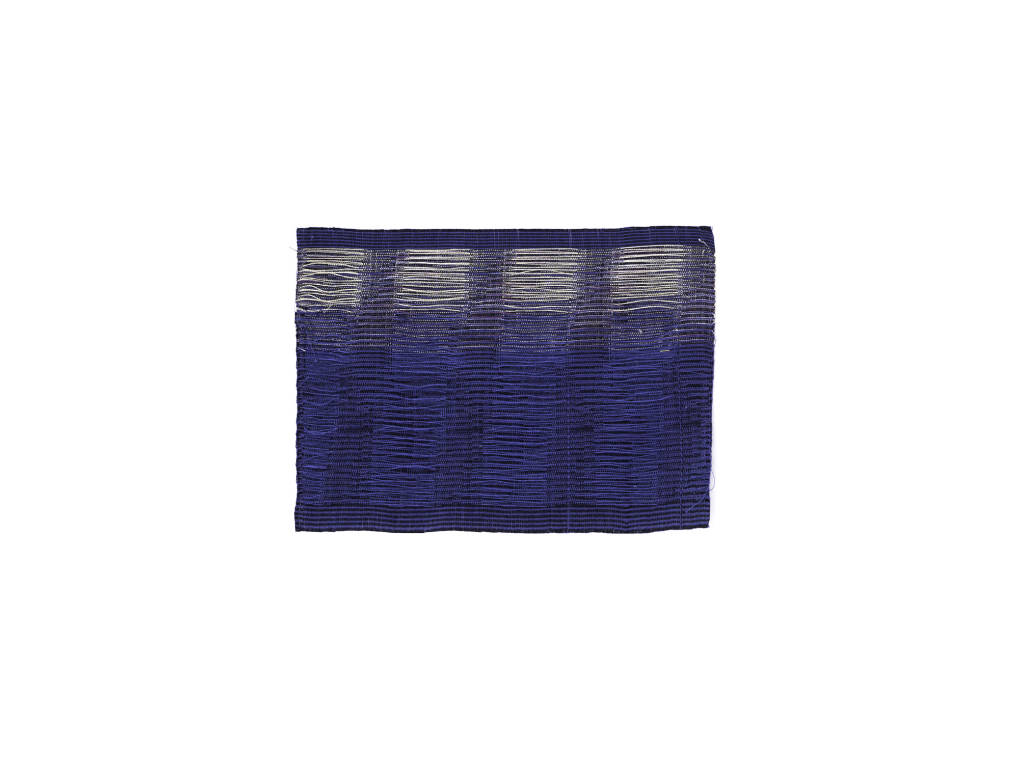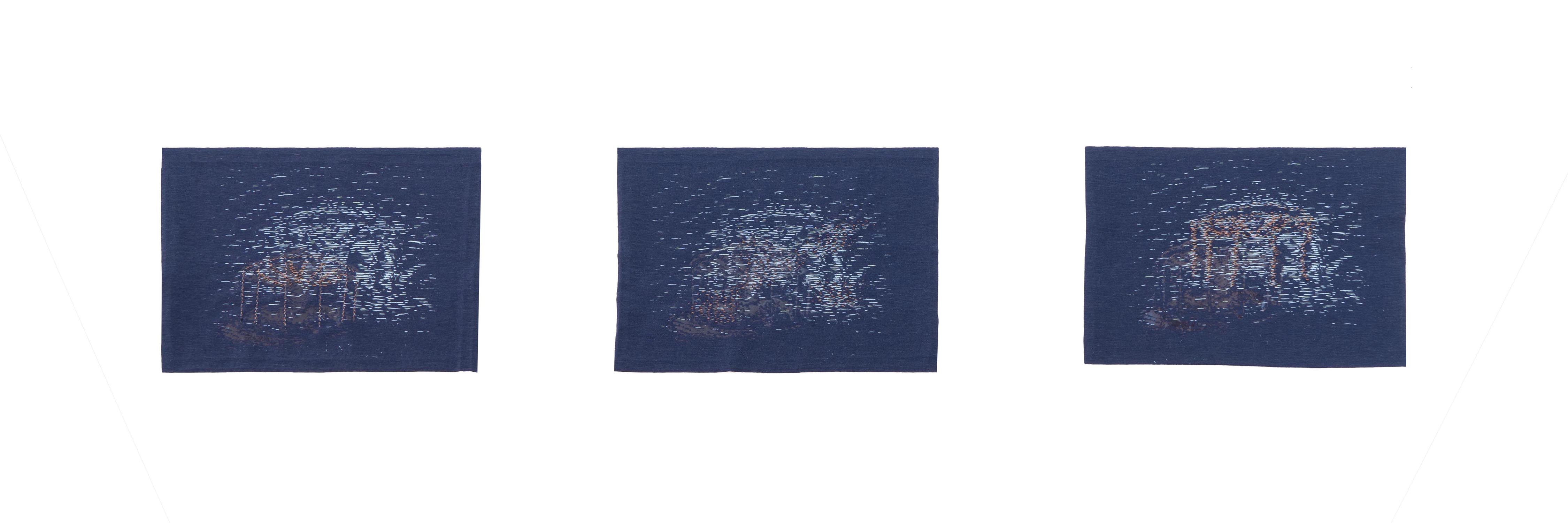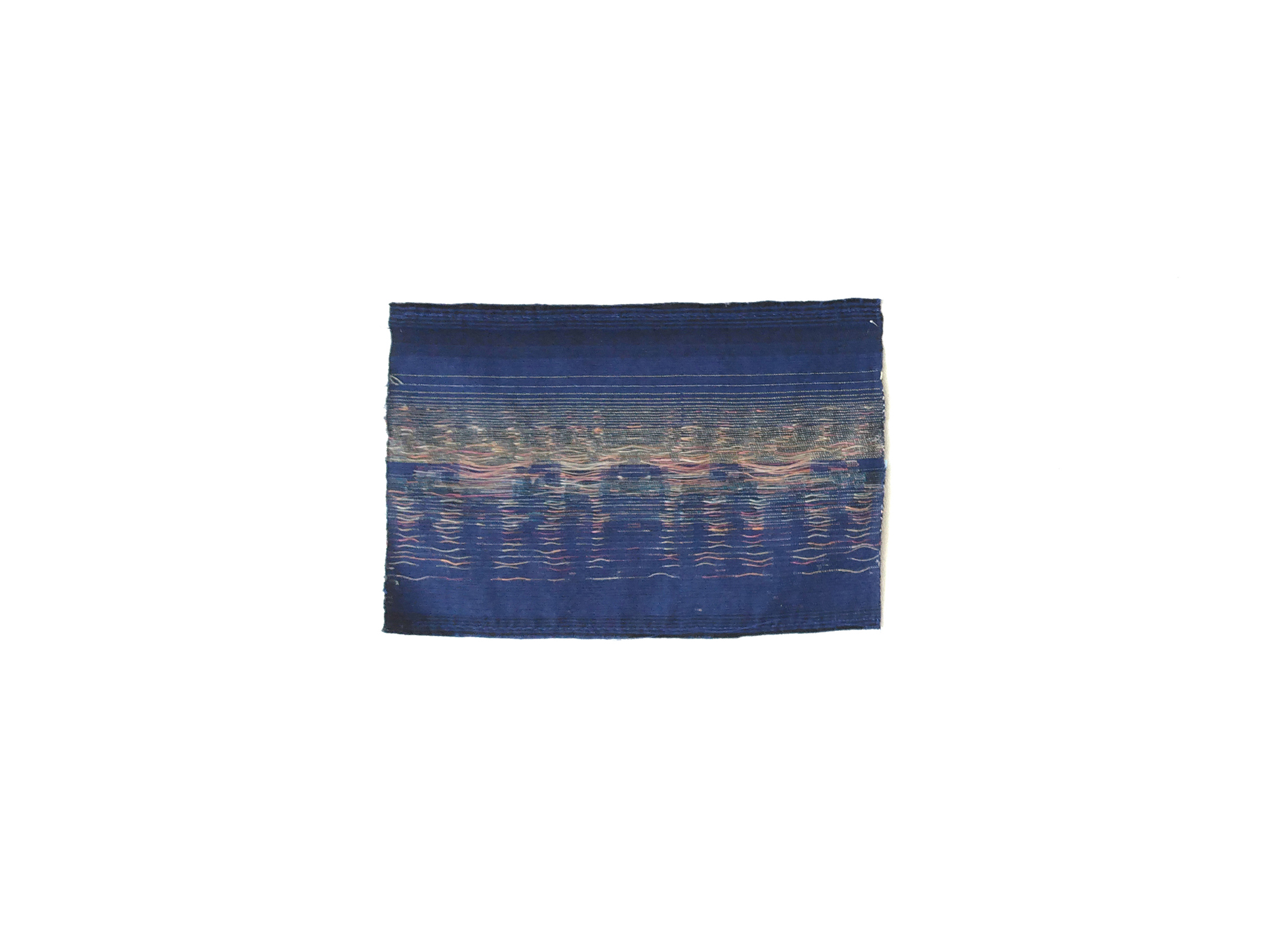 Mon travail de tissage s’est attaché à ce qui me semblait pouvoir résumer, ramasser, l’apparition de ce lieu qui n’en est pas un : un carrousel et ses lumières en mouvement à la tombée du jour. Jouant avec l’eau et ses reflets pour évoquer l’éphémère et le mouvant – on ne se baigne jamais dans la même eau -, je réalise qu’en tissant des ‘flottés’, des fils non pris dans le tissage, je reviens à l’origine même de l’adjectif forain : « ce qui dépasse à l’extérieur »…