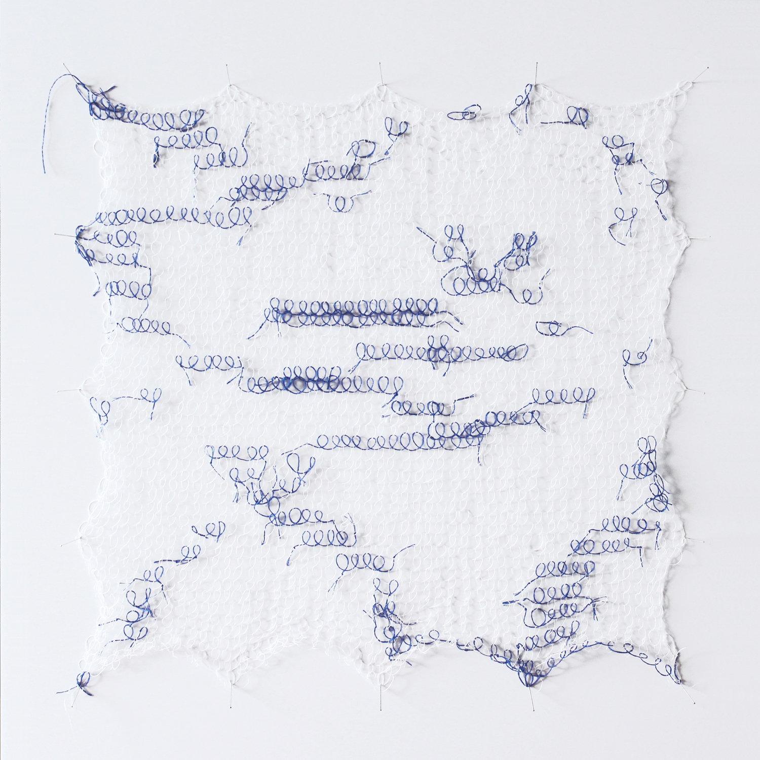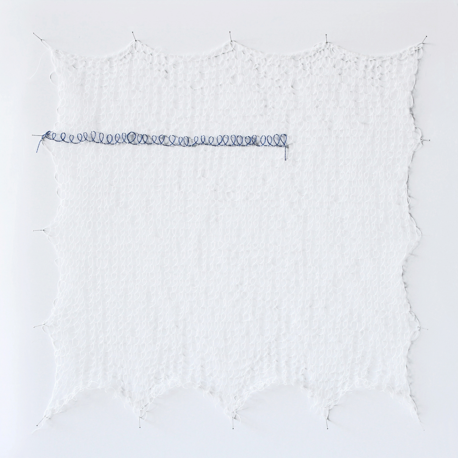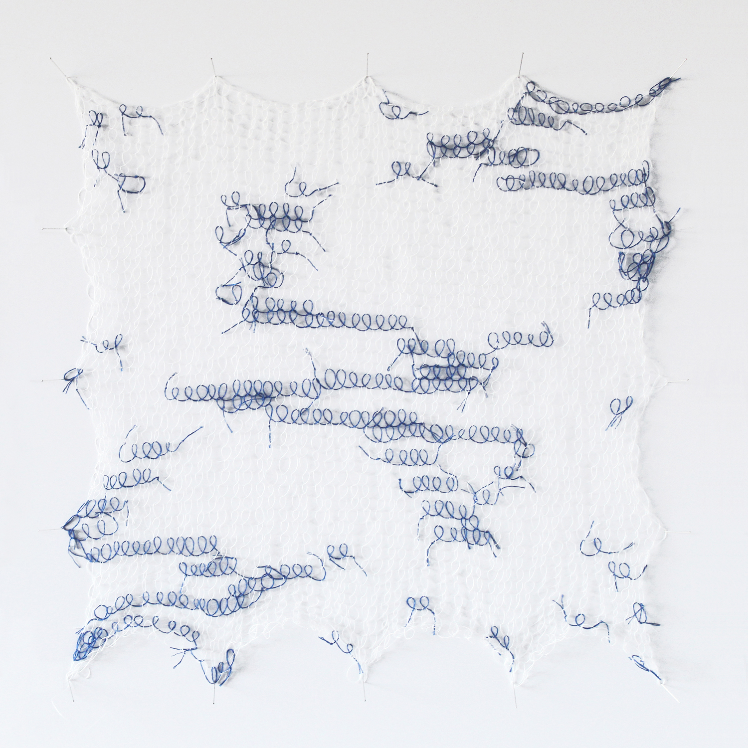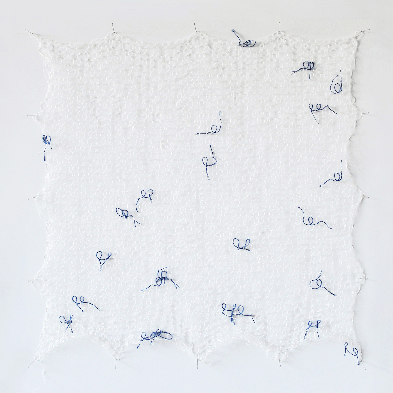En me remettant au tricot, j’ai trouvé un point, en ajoutant une torsion au point jersey, qui forme une boucle similaire à celle de l’écriture manuscrite. J’ai choisi un fil dont la couleur s’apparente à celle du stylo bille bleu. J’ai répété cette boucle un très grand nombre de fois, jusqu’à obtenir des surfaces à l’échelle de mon corps. Le fil est devenu une ligne d’écriture matérielle, avec une texture, une ombre.