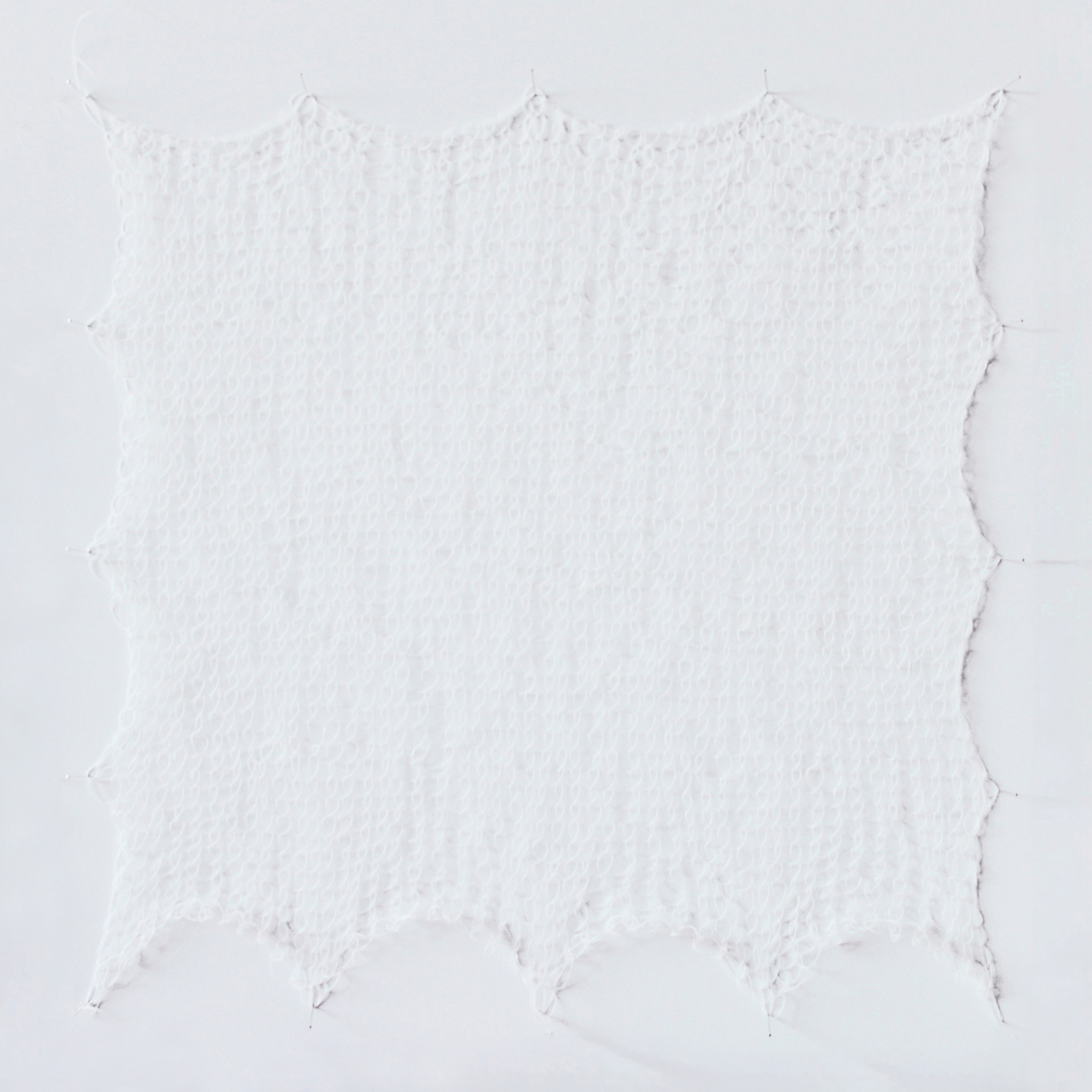 J’ai tenté d’accrocher ces pièces de plusieurs façons, les tendre était la seule manière de rendre tout à fait lisible leur écriture. Mes épingles, que j’aime pour leur discrétion et leur précision, me permettent de les tendre à même le mur. Plus que des outils de piquage ou d’accrochage, je les considère comme faisant partie des œuvres.