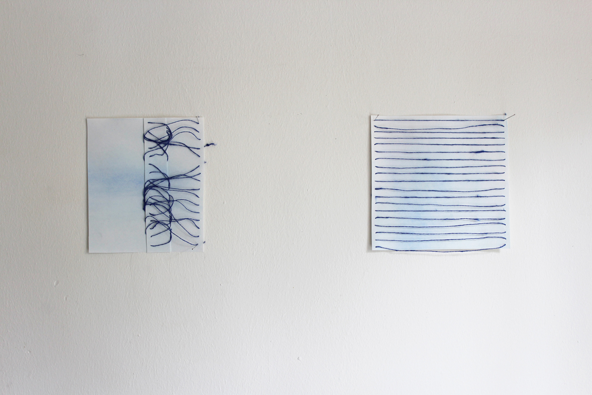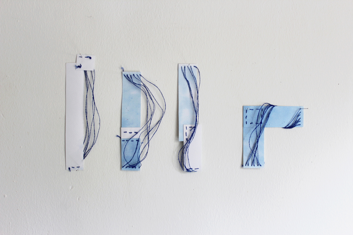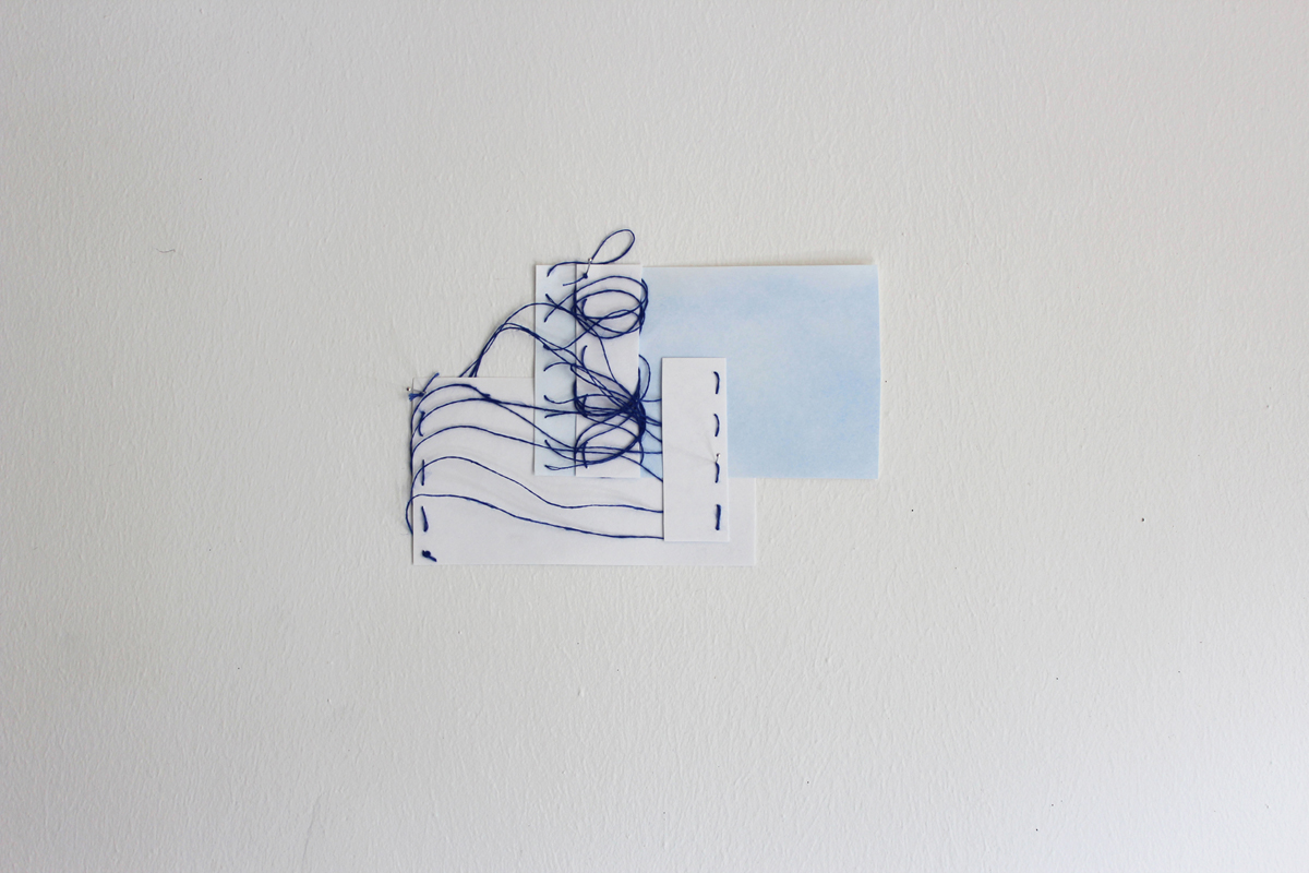 Petits collages où les ciseaux coupent le papier, le papier contraint le fil, et le fil échappe aux ciseaux.